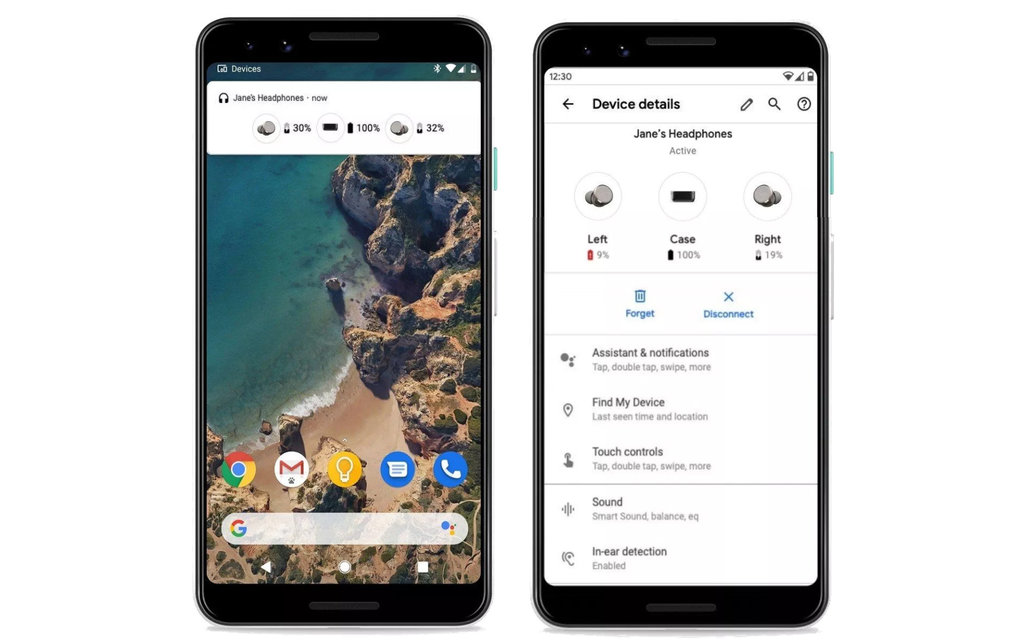Najwyraźniej Google również daje sobie z tego sprawę, gdyż firma zdecydowała do dodać do Androida Q nowe menu Bluetooth. Z poziomu dość atrakcyjnej wizualnie sekcji możemy sprawdzić naładowanie akumulatorów słuchawek, a także pozostałych podpiętych do smartfona urządzeń Bluetooth. Dodatkowo, przy pierwszym parowaniu pojawi się stosowne powiadomienie z potrzebnymi informacjami.