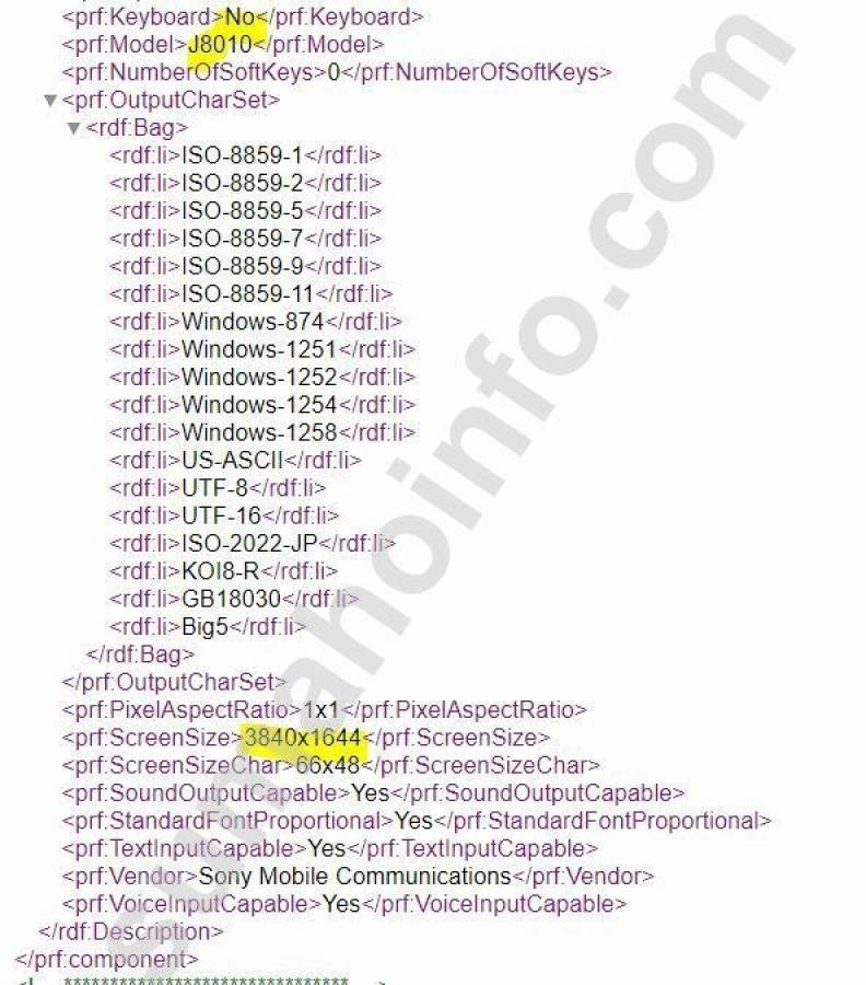„Prawidłowe” proporcje ekranu posiada telefon sklasyfikowany pod numerem J8010, którego rozdzielczość obrazu ma wynosić 3840×1644 pikseli – dokładnie takimi samymi parametrami cechuje się Xperia 1.