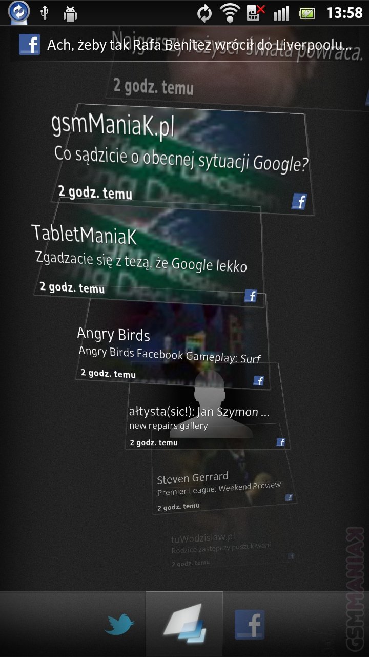 Doskonale znany ze smartfonów Sony Ericsson. Pozwala na łączenie w jednym miejscu wiadomości z Facebook’a, Twittera oraz SMSów. Stylizowane na trójwymiarowe przewijanie kolejnych wiadomości działa poprawnie, nie zdarzyło mi się przyłapać urządzenia na chociażby najmniejszym lagu. Timescape cały czas pozostaje przydatną aplikacją.