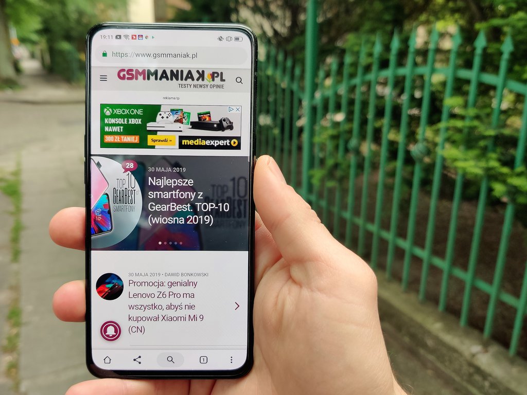 Jeśli chodzi o aparat selfie o rozdzielczości 16 MP, to został on przeniesiony na wysuwany z górnej krawędzi moduł w kształcie płetwy rekina. Dzięki temu ekran AMOLED o przekątnej 6,4 cala wypełnia niemal cały front urządzenia, mimo że nie ma ani wcięcia, ani dziurki. Ma za to zintegrowany czytnik linii papilarnych.