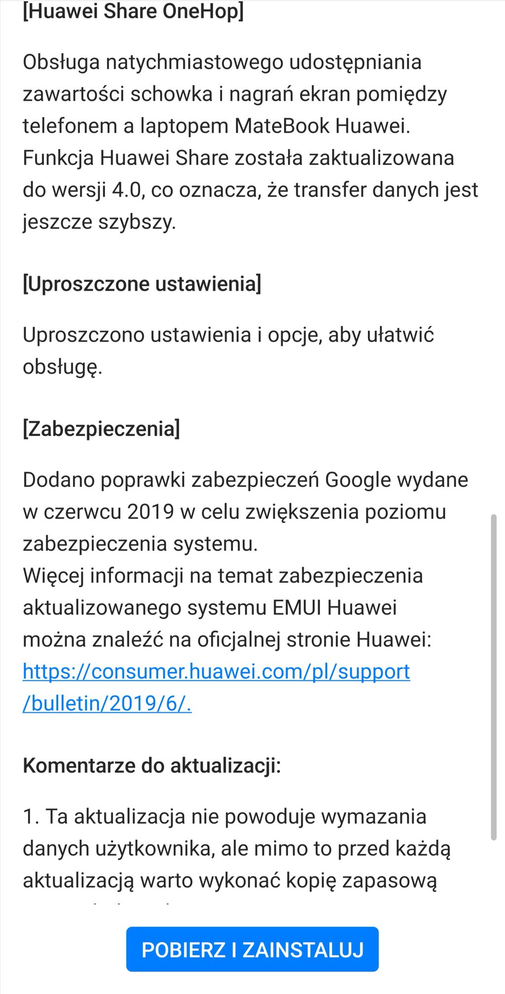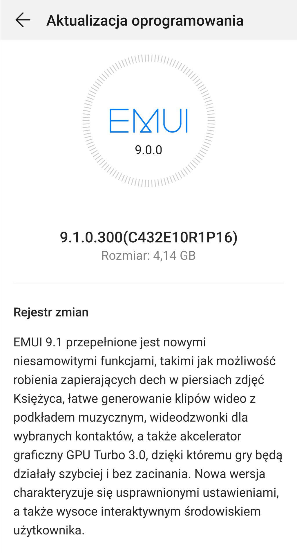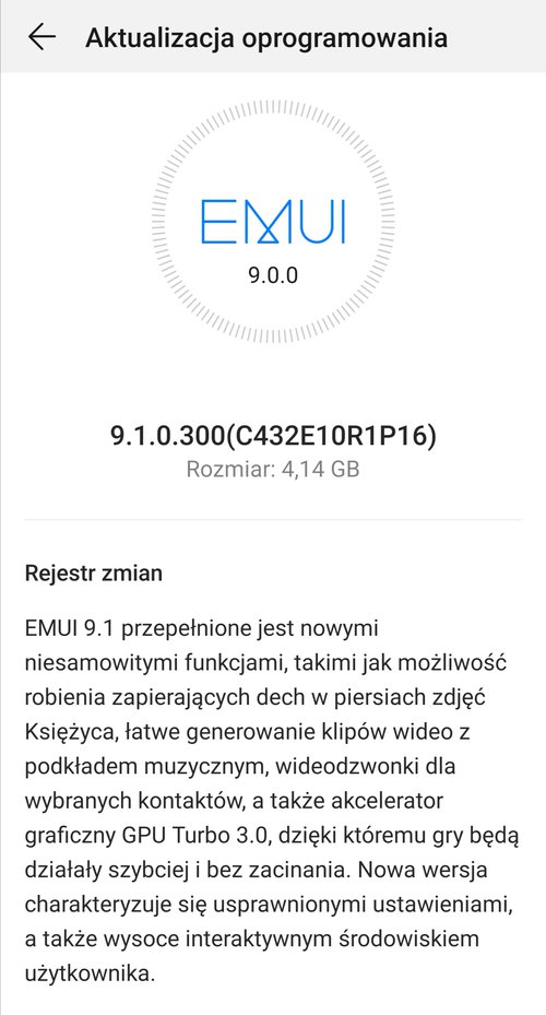 Poniżej zamieszczam pełną listę zmian, która wkrótce powinna zagościć na Waszych smartfonach. Paczka waży ponad 4 GB i jest oznaczona numerem 9.1.0.300(C432E10R1P16) – nie mylić z paczką 9.0.1…, która często jest mylnie odbierana jako kolejna wersja EMUI.