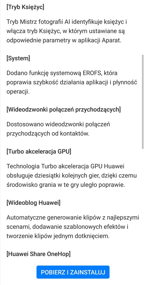 Huawei usprawniło także technikę udostępniania treści Huawei Share, uprościło ustawienia telefonu, dodało wideodzwonki połączeń przychodzących oraz wprowadziło sławny tryb Księżyc, dzięki któremu smartfon rozpozna naszego satelitę i umożliwi wykonanie mu ładniejszego zdjęcia.