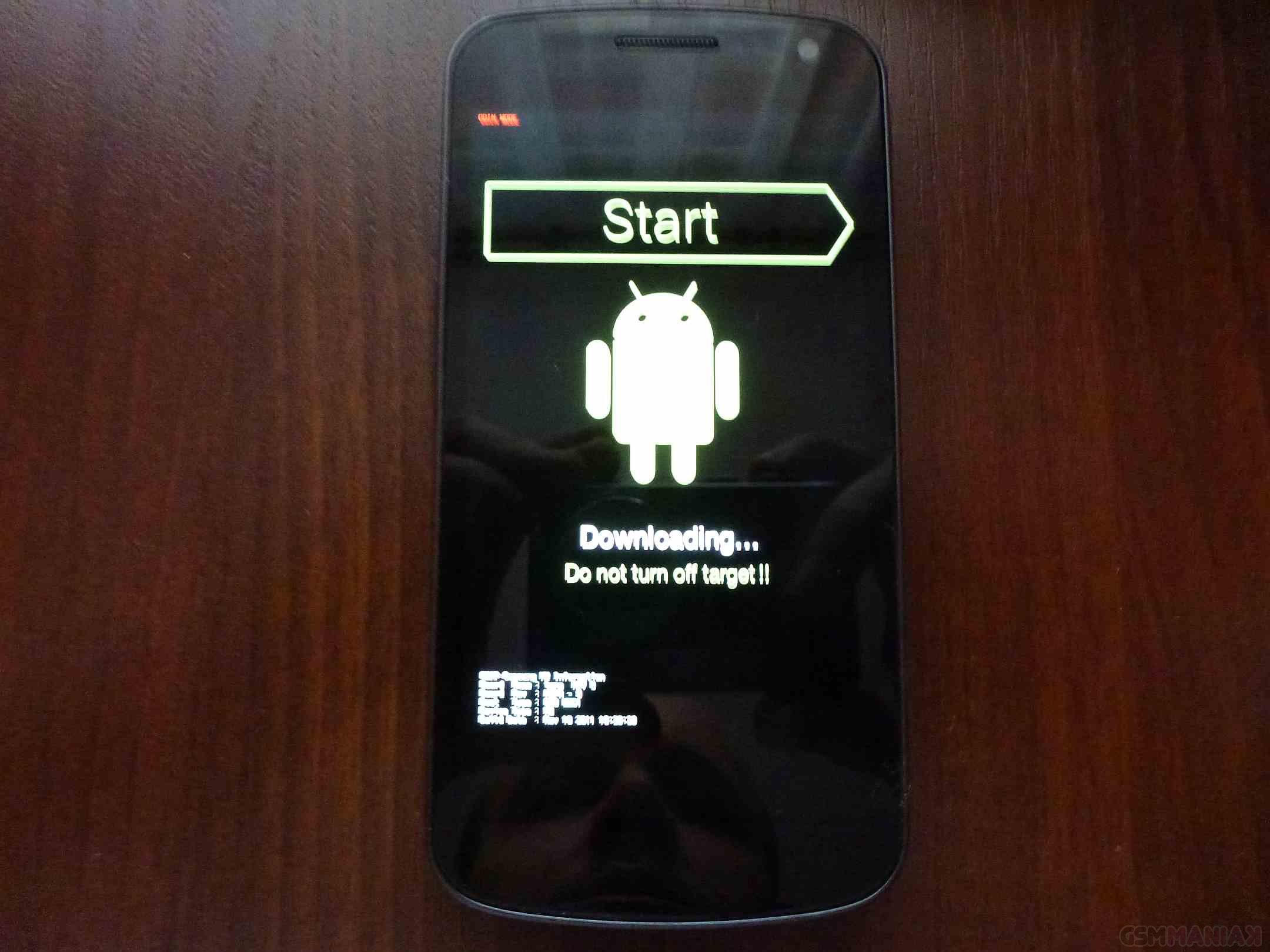 Teraz musimy odpalić nasz telefon w trybie downloadmode. Wyłączamy całkowicie naszego Nexusa, sięgamy po kubek z herbatą czy kawą, bierzemy łyk i zaczynamy. Każdy Galaxy Nexus ma tylko trzy fizyczne przyciski. Na prawej ścianie przycisk POWER a na lewej dwa przyciski regulacji głośności. Klikamy dolny przycisk regulacji głośności i trzymając go cały czas, wciskamy przycisk POWER. Powinniśmy zobaczyć zielonego robota i napis „Downloading”. Teraz odpalamy program jaki wypakowaliśmy z tego folderu i podpinamy naszego Nexusa do komputera. Jeśli po minucie, dwóch, jeden z prostokątów zabarwi się na żółto, wszystko przebiega dobrze. Klikamy start, idziemy po coś słodkiego do jedzenia, gdyż cały proces instalacji Androida 4.0.1 może zająć kilka minut.