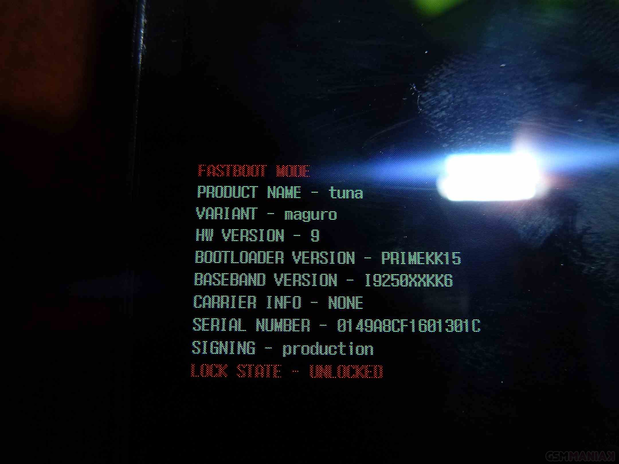 Widok jaki powinniście mieć teraz przed oczyma to leżący robocik od Google z otwartą klapą na wysokości brzuszka. Poniżej będą dwie bardzo ważne informacje. Na czerwono powinniście widzieć napis „Fastboot Mode” a na samym dole „Lock State”. Jeśli przy Lock State pisze „locked”, to mamy (jeszcze) zablokowany telefon i nie zdołamy wgrać Androida 4.0.2. Ale spokojnie, twórca Galaxy Nexus Toolkit pomyślał i o tym.