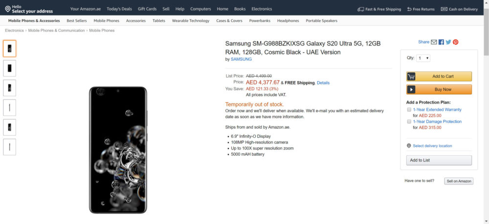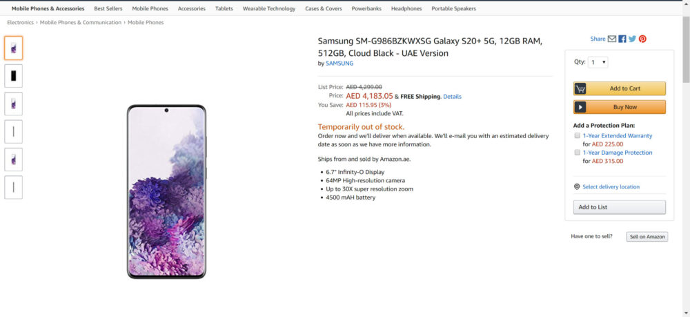 Dość niespodziewanie Amazon ze Zjednoczonych Emiratów Arabskich opublikował na swojej stronie kilka informacji na temat specyfikacji, ceny i wyglądu smartfona Samsung Galaxy S20.