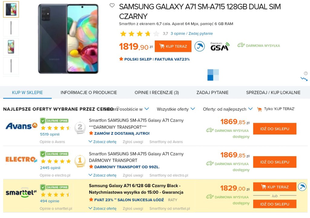Postanowiłem zajrzeć do porównywarki cen i zauważyłem, że takie sklepy jak Avans, Electro, Neo24 czy OleOle! sprzedają Galaxy A71 za 1869,85 złotych, co w porównaniu z ceną początkową oznacza obniżkę o trochę niemal 130 złotych.
