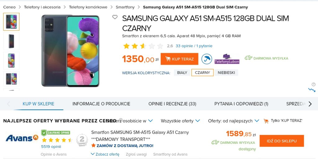 Jeśli chodzi o Galaxy A51, to w tych samych sklepach jego cena spadła do poziomu 1589,85 złotych (niecałe 110 złotych taniej).