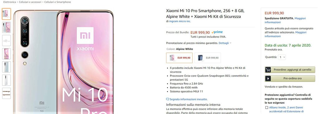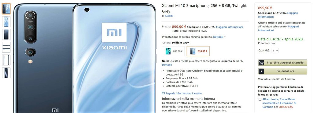 Włoski Amazon oferuje smartfon Xiaomi Mi 10 w przedsprzedaży, w wersji 8/256 GB. Jego cena to 899,90 euro, co po wyrównaniu podatku VAT, doliczeniu kosztów wysyłki i bezpośrednim przeliczeniu daje nam niecałe 4160 złotych. Wysyłka ma nastąpić po 7 kwietnia.
