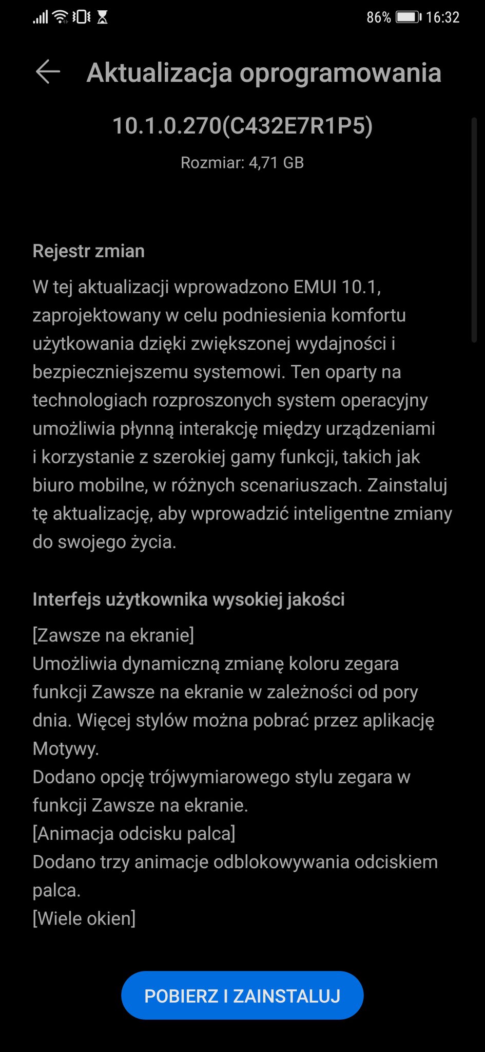 Paczka waży 4,7 GB i jest oznaczona numerem 10.1.0.270 (C432E7R1P5). Najlepiej wywołać aktualizację poprzez aplikację Wsparcie i menu Szybkie usługi – po jego rozwinięciu należy wybrać opcję Aktualizacja.