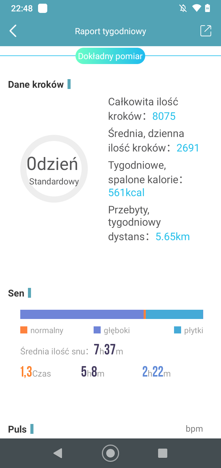 Raport tygodniowy zestawia najważniejsze informacje – znajdziemy tam wykresy saturacji i pulsu, ilość kroków, spalone kalorie, przebyty dystans, jakość snu:
