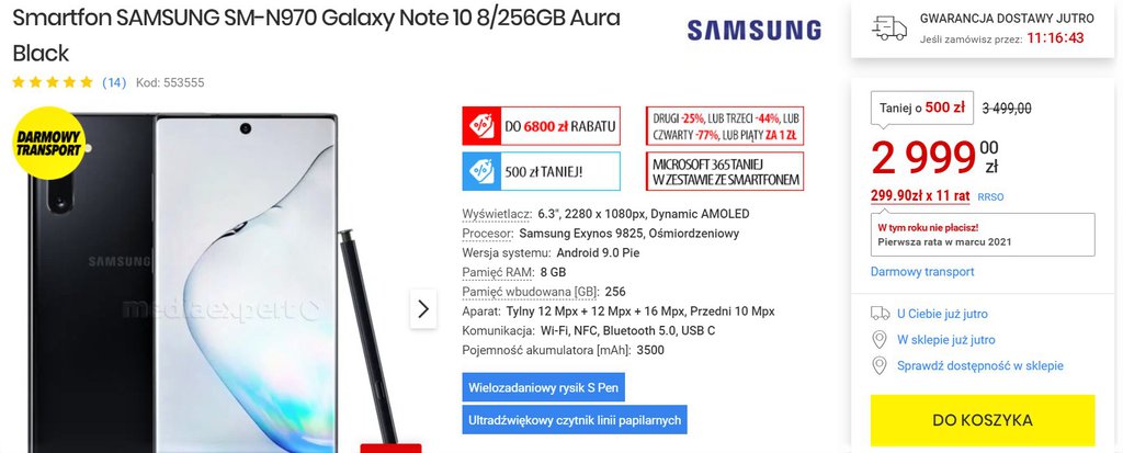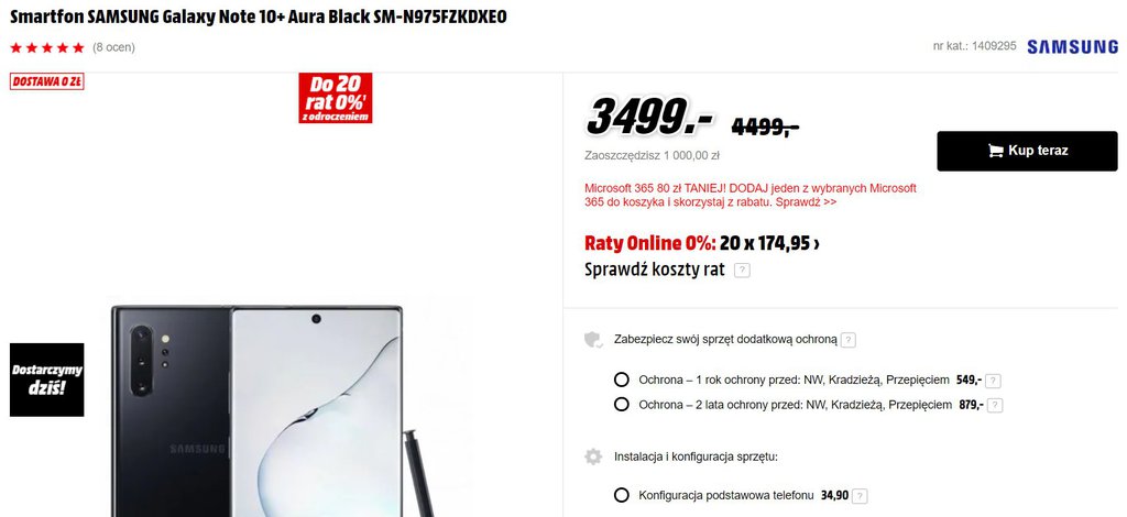 - Samsung Galaxy Note 10+ – 3499 złotych (tylko w stacjonarnych sklepach Media Expert, online w MediaMarkt i x-kom, RTV EURO AGD).