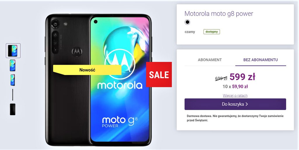 W sklepie Play bez umowy kupisz w cenie 599 złotych dwa modele: Realme 6i oraz Motorola Moto G8 Power. Oba chwalą się baterią 5000 mAh i znane są z bardzo długiego czasu pracy.