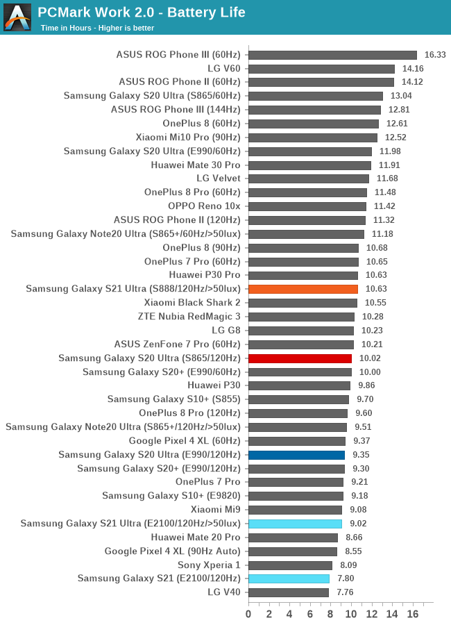 - Snapdragon 888 vs Exynos 2100 w Samsung Galaxy S21 Ultra – porównanie czasu pracy / fot. AnandTech