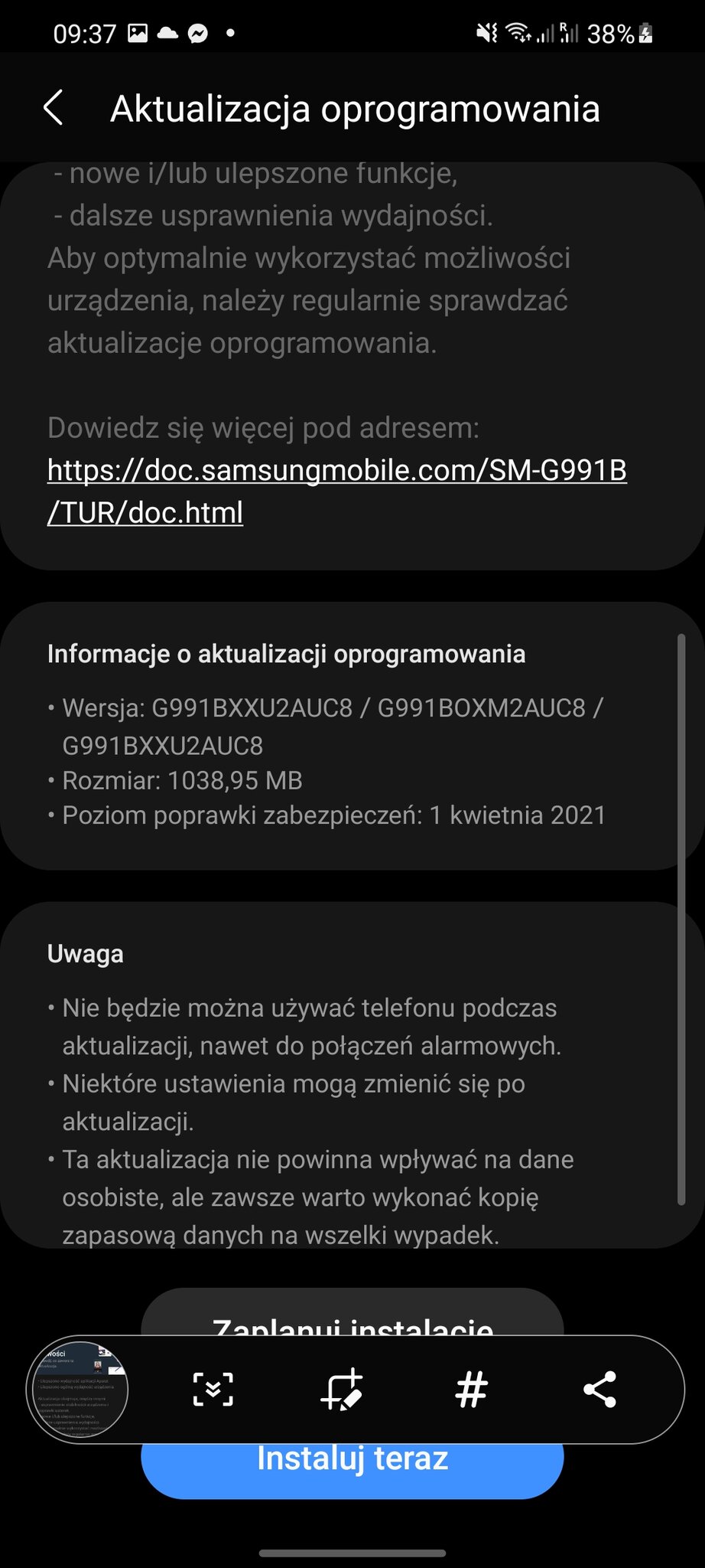 Na początek zaznaczę, że mój egzemplarz pochodzi z wolnej sprzedaży, a oprogramowanie nie jest w żaden sposób brandowane, ale nie kupiłem go w Polsce. Aktualizacja oznaczona numerem G991BXXU2AUC8 może pojawić się na Twoim Galaxy S21 w innym terminie.
