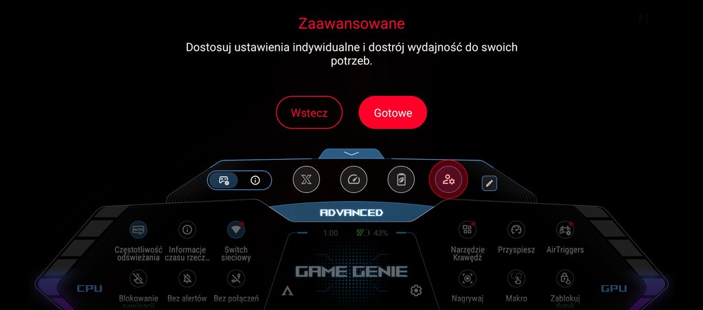 Producent wprowadził również tzw. „Dżina Gier”, czyli podręczne menu, które w trakcie gry pozwala na przełączanie się między predefiniowanymi ustawieniami, a także informuje nas o aktywnych parametrach telefonu, odświeżaniu, a także temperaturze procesora.