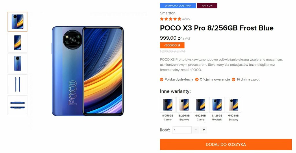 Jeśli interesuje Cię model z niższej półki cenowej, to koniecznie rozważ zakup Xiaomi POCO X3 Pro (8/256 GB) za 999 złotych. Porównywarce cen mówi jasno – taniej go w Polsce nie kupisz.