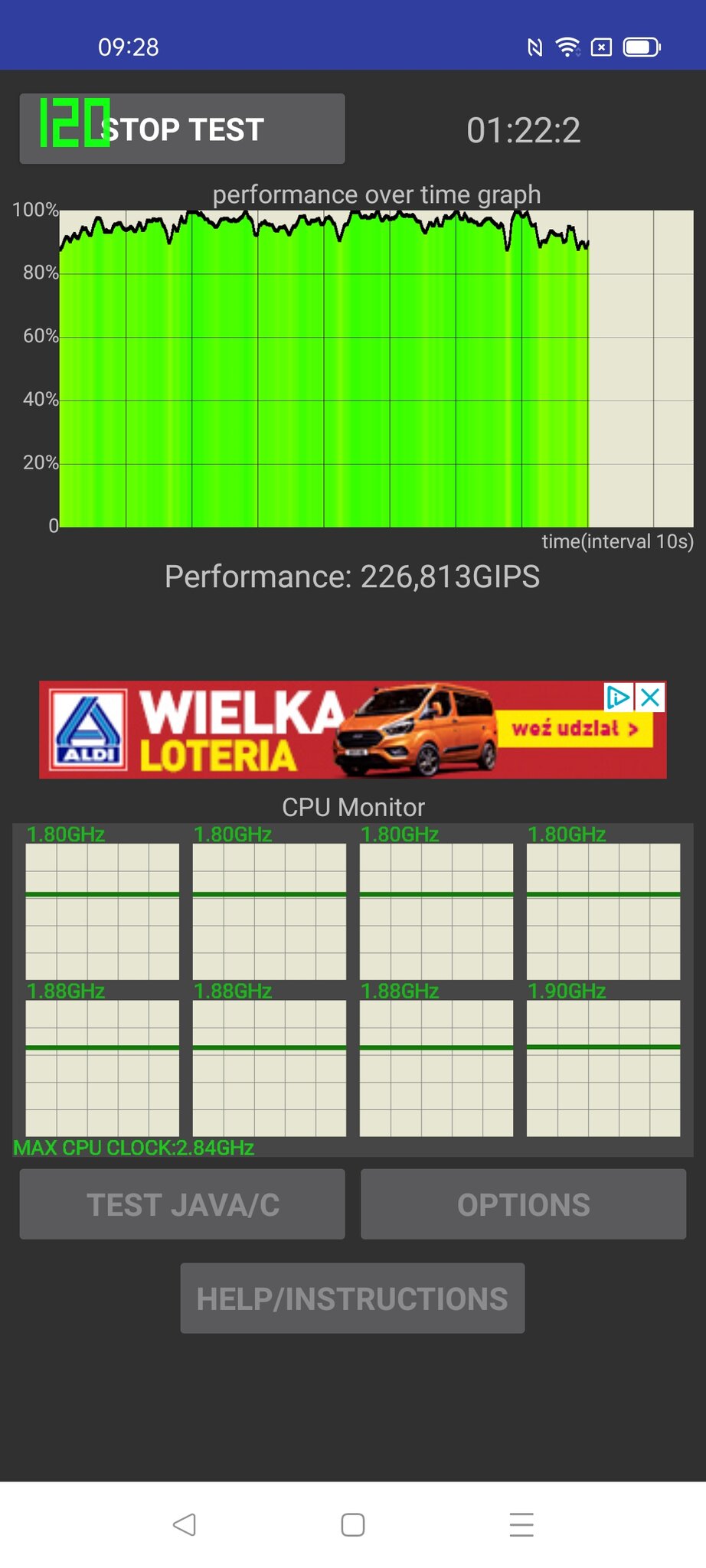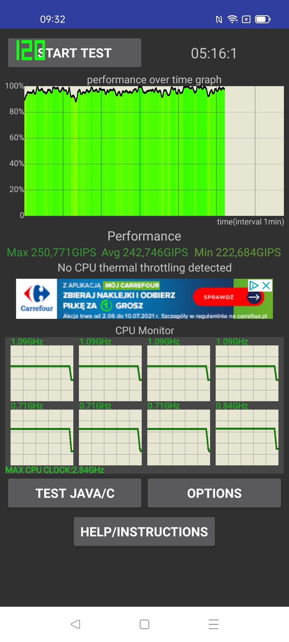 W codziennych zastosowaniach realme GT śmiga jak Ford GT. Nie mogło być inaczej. Co więcej, nie traci on mocy nawet przy dłuższym obciążeniu. Po teście badającym moc GPU odpaliłem test sprawdzający utratę wydajności CPU w czasie. Nie wskazał on żadnego throttlingu, a obudowa telefonu zrobiła się tylko ciepława.