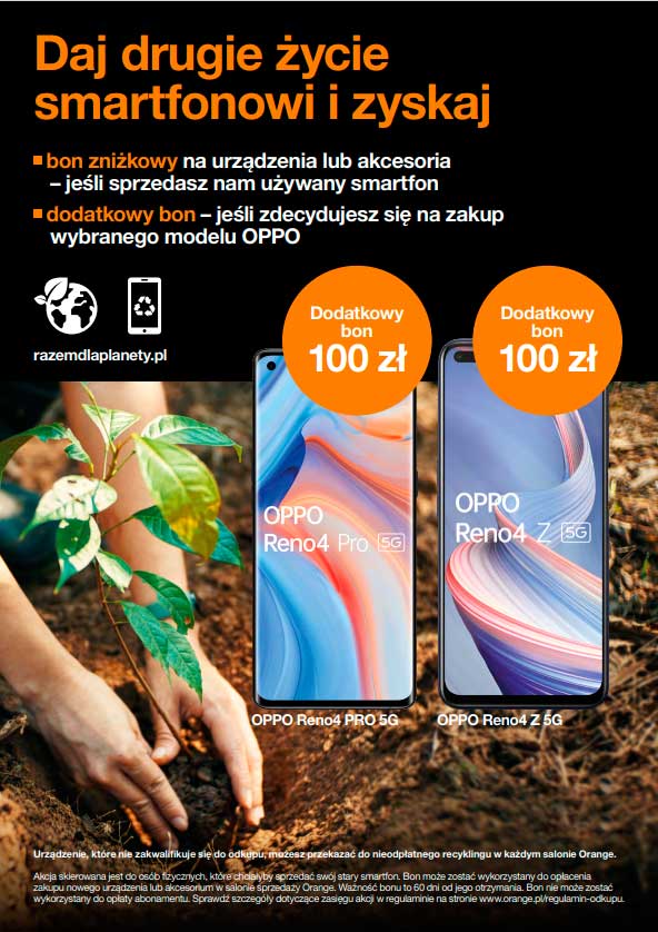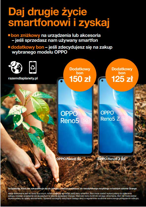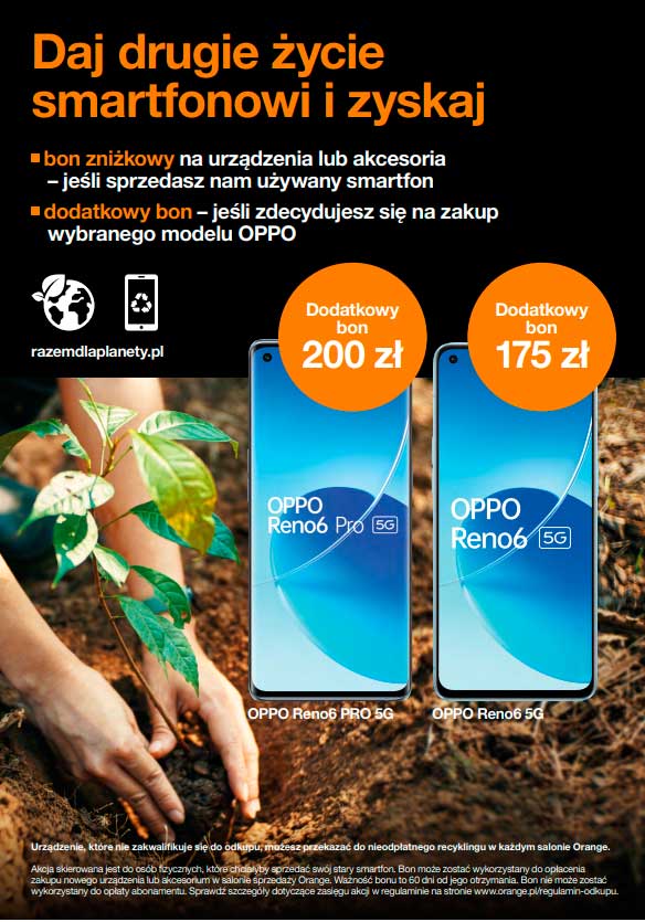 W ramach akcji odkup telefonu prowadzonej przez operatora Orange, przynosząc stare urządzenie do salonu, można zyskać do 200 złotych rabatu na zakup jednego z sześciu smartfonów marki OPPO z rodziny Reno.