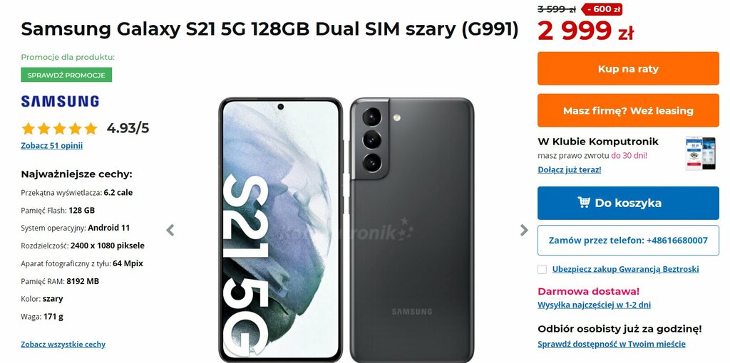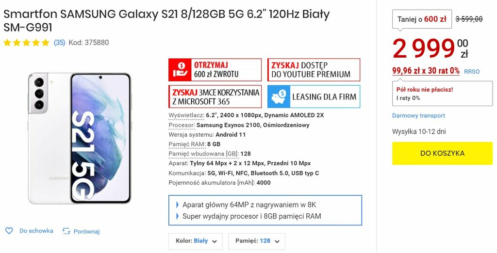 To jeszcze nie wszystko. Przypominam, że ciągle trwa promocja Samsung ze zwrotem 600 złotych za zakup Galaxy S21. Odliczając tę kwotę, otrzymamy cenę 2399 złotych za wersję 8/128 GB i 2599 złotych za konfigurację 8/256 GB.