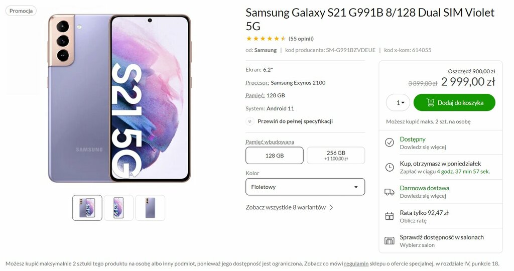 - x-kom, gdzie możesz kupić maksymalnie dwie sztuki — fioletowy (szary i różowy w wariancie 256 GB).