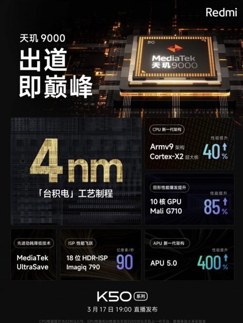 Jak słusznie się domyślacie, modele Redmi K50 będą wypakowane technologiami. Przede wszystkim zaoferują przyszłym użytkownikom trzy różne procesory – w najtańszym K50 będzie to Qualcomm Snapdragon 870, w droższym K50 Pro MediaTek Dimensity 8000, a w najdroższym K50 Pro+ znajdzie się MediaTek Dimensity 9000.