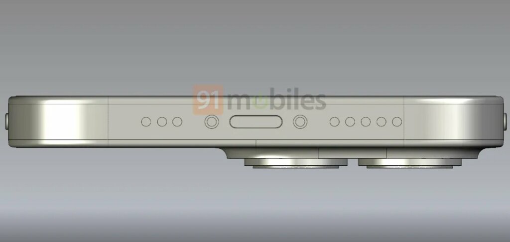 Rzut na dolną i górną krawędź pokazuje, jak mocno będą wystawać aparaty. Pierwszy stopień to wyspa obiektywów, a ponad nią wystają jeszcze poszczególne aparaty. Oczywiście nie ma mowy o powrocie złącza jack 3.5 mm, ale na to chyba nikt nie liczył. Czy złącze to USB-C? Tak mówią przecieki, tutaj ciężko to stwierdzić.