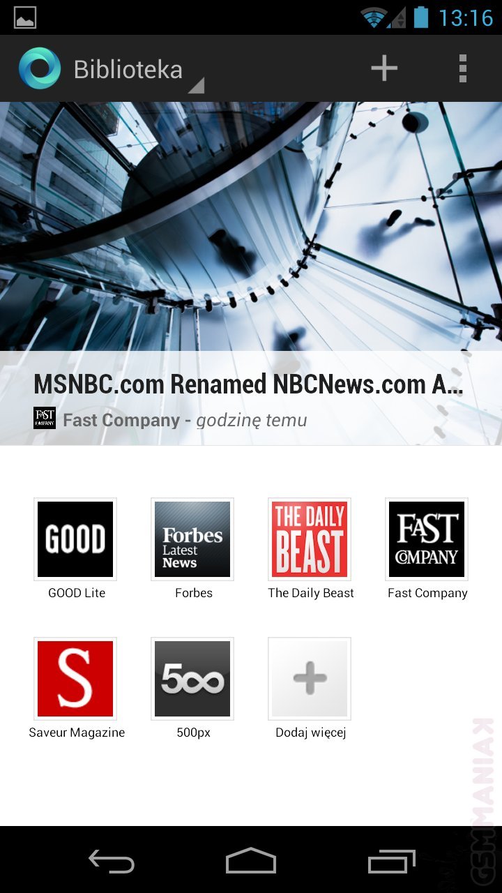 Google postanowiło przybliżyć nam nieco tych funkcji, którymi cieszą się już od jakiegoś czasu użytkownicy Androida, którzy mają dowód osobisty sygnowany pieczęcią Stanów Zjednoczonych. Niestety, w obydwu aplikacjach jest to raczej pierwszy akord aniżeli dobrze skomponowana usługa, która cieszy się chociażby przeciętną popularnością wśród polskich użytkowników. Google Currents to pewnego rodzaju e-czytelnia ciekawych gazet, magazynów, jednak trudno znaleźć tam interesujące tytuły w języku polskim. Można próbować z automatycznym tłumaczem Google, jednak jego poziom jest po prostu zbyt niski, aby zapewnić komfortowe przeglądanie tego typu treści, choć cieszy możliwość podpięcia pod program wybranych kanałów RSS z ulubionych polskich stron, w tym rzecz jasna obowiązkowo gsmManiaKa 😉