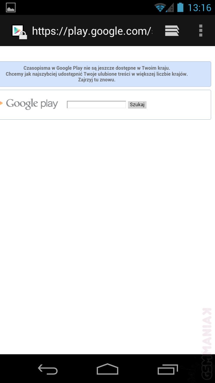 Czasopisma Play, to jeszcze ciekawsza sprawa. Zapewne będzie to wkrótce ciekawa usługa o zasadach zbliżonych do prenumeraty płatnych tytułów, jednak obecnie dostajemy tylko przekierowanie na odpowiednią podstronę w Google Play i komunikat, że usługa nie jest dostępna dla Polski. Ot i cała tajemnica Czasopism.