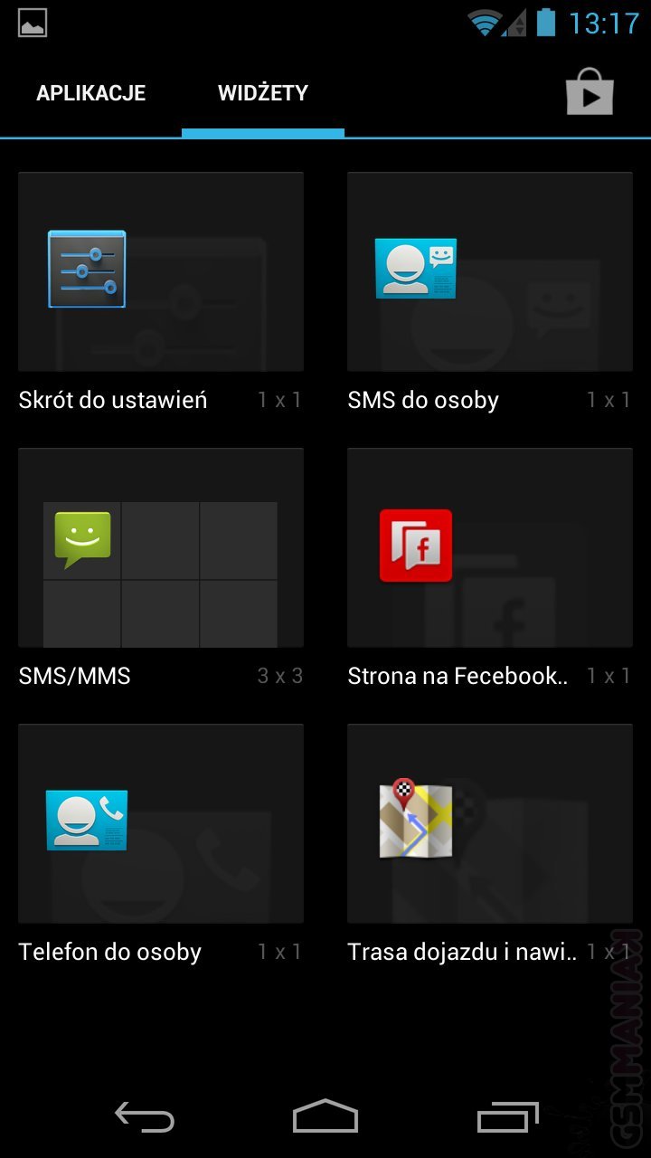 Android 4.1 przyniósł ze sobą zmianę w filozofii widżetów. Już nie trzeba się męczyć, aby dopasować dany widżet do wybranego pulpitu startowego, bowiem system zrobi to za nas a na dodatek ładnie posegreguje nam ikonki. Działa to całkiem spójnie i logicznie, jednak jestem pewien, że część z Was, podobnie jak ja, zaraz po takiej automatycznej segregacji weźmie się za szybkie przekładanie ikonek z miejsca na miejsce i dopasowywanie ich według własnych zasad. Funkcja ciekawa, acz jej przydatność jest po prostu nieduża.