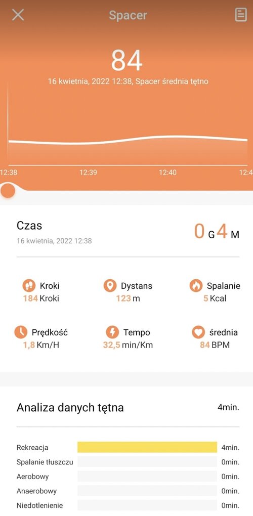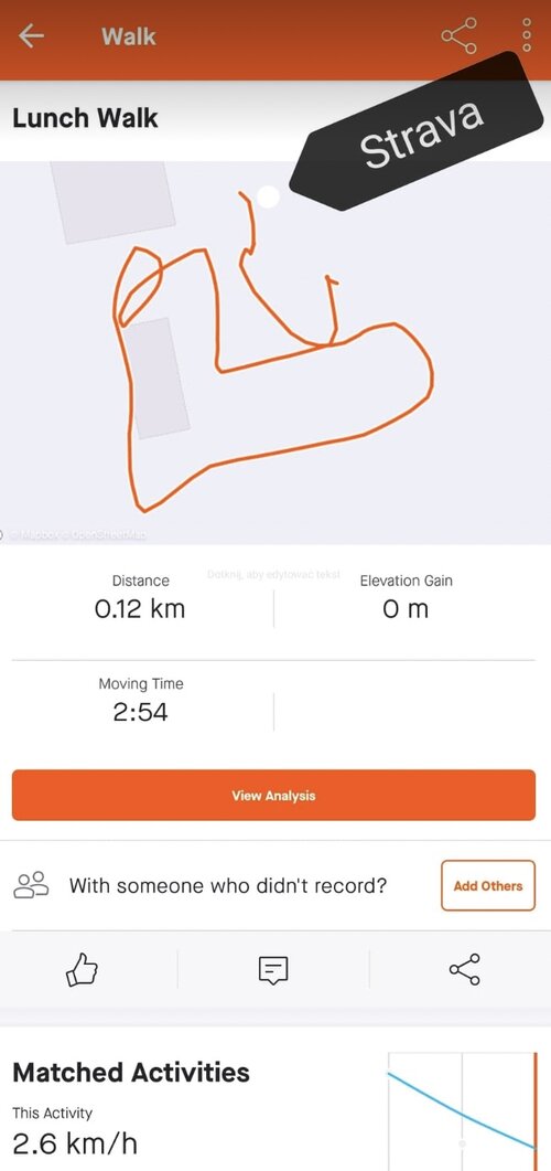 Podczas treningu zegarek określa dystans na podstawie GPS-u z telefonu – trzeba go zatem zabrać ze sobą na każdą aktywność. Poniżej znajdziecie najprostsze porównanie statystyk ze spaceru: smartwatch kontra Strava.