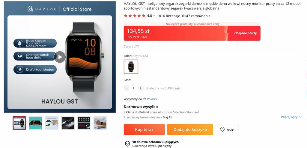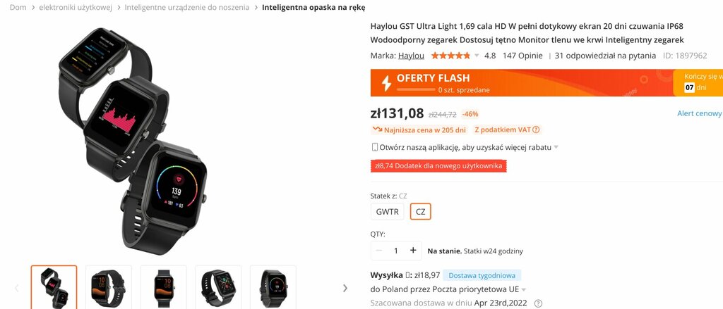 Buszując w poszukiwaniu wyprzedaży na smartwatche, natrafiłem na bardzo dobrą promocję na Haylou GST. Ten zegarek Xiaomi na Allegro kosztuje teraz tylko 149 złotych. Nie przypominam sobie, by kiedykolwiek tak tanio dało się go kupić w Polsce.