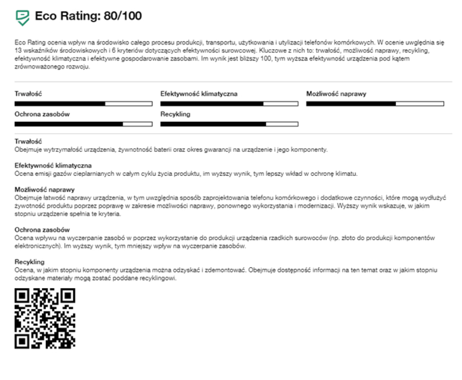Wynik, jaki sprzęt uzyska we wszystkich kategoriach, podawany jest w skali do 100 – im wyższy, tym lepiej. Taka ocena jest podawana w sklepie internetowym Orange Polska – jest widoczna tuż pod nazwą modelu smartfona. Po najechaniu na etykietę pojawia się szczegółowa informacja z danymi.