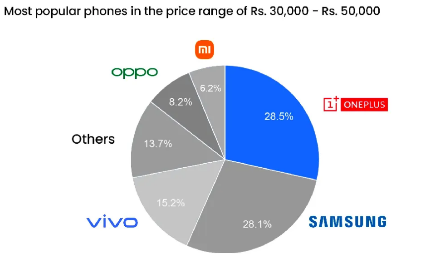 Agencja MSP przygotowała raport, w którym przeanalizowano rynek smartfonów w Indiach. Szczególnie ciekawy jest zakres od 30 do 50 tysięcy rupii. Koresponduje to z naszą półką superśredniaków. To segment od 1800 do 3000 złotych. Zaskakująco mocną pozycję osiągnął OnePlus. Aż 28.5% wszystkich sprzedawanych smartfonów to modele tego producenta.