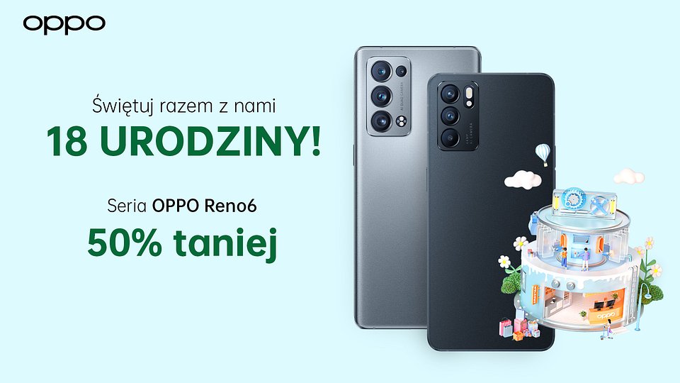 Już jutro, 17 września, w wybranych sieciach handlowych wystartuje promocja na OPPO Reno 6 5G z okazji 18 urodziny marki OPPO. Oferta będzie obowiązywała przez cały dzień lub do wyczerpania zapasów.