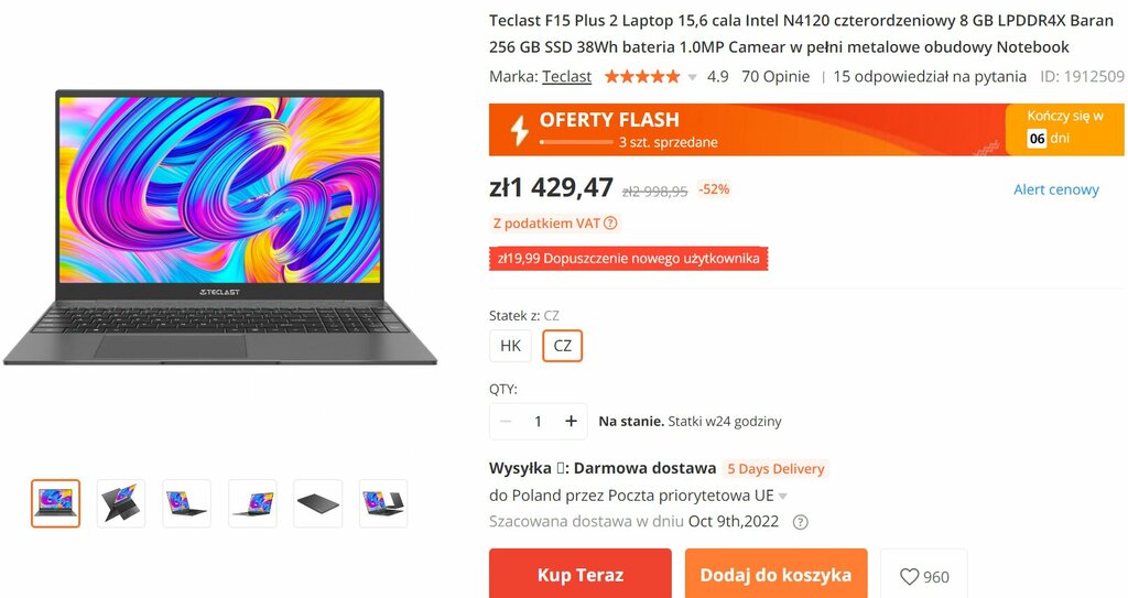 Kilka dni temu tani laptop Teclast F15 Plus 2 był w promocji za 1800 złotych. Już wtedy była to dobra cena. Dzisiaj jest wręcz genialna, bo z Czech znalazłem go za 1400 złotych!