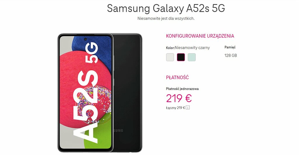 Jeśli chodzi o Samsung Galaxy A52s 5G, to niemiecki T-Mobile sprzedaje go w ofercie bez umowy za 219 euro, czyli troszkę ponad 1030 zł. Tymczasem u nas, według Ceneo, zapłacić trzeba niecałe 1400 zł.