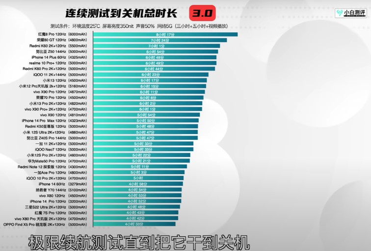 - NUBIA Red Magic 8 Pro (FHD + 120 Hz) (6000 mAh) – 8 godzin 17 minut,