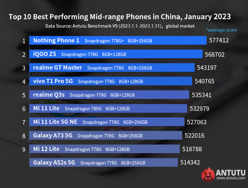 Zestawienie zaczynamy od 10 najlepszych średniaków na rynku. Dominacja Snapdragona 778G to po prostu masakra na konkurencji. Sam niedawno kupiłem sobie telefon z tym układem – i to już 3 z kolei. Pierwsze miejsce zajmuje Nothing Phone (1), którego również używam. 7 jest Xiaomi Mi 11 Lite 5G NE, z którego korzystałem miesiącami. Od lat nie widzieliśmy lepszego SoC.
