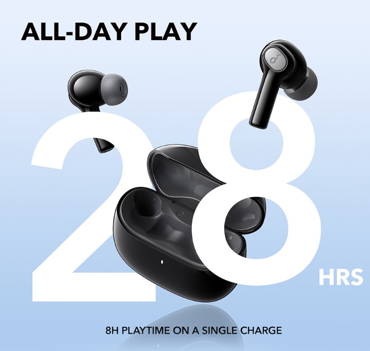 Bateria modelu pozwala na 28-godzinny czas odtwarzania muzyki wraz z etui ładującym. Gdyby zabrakło Ci przenośnego powerbanku w postaci opakowania na słuchawki, to czas pracy na jednym cyklu wynosi 8 godzin.