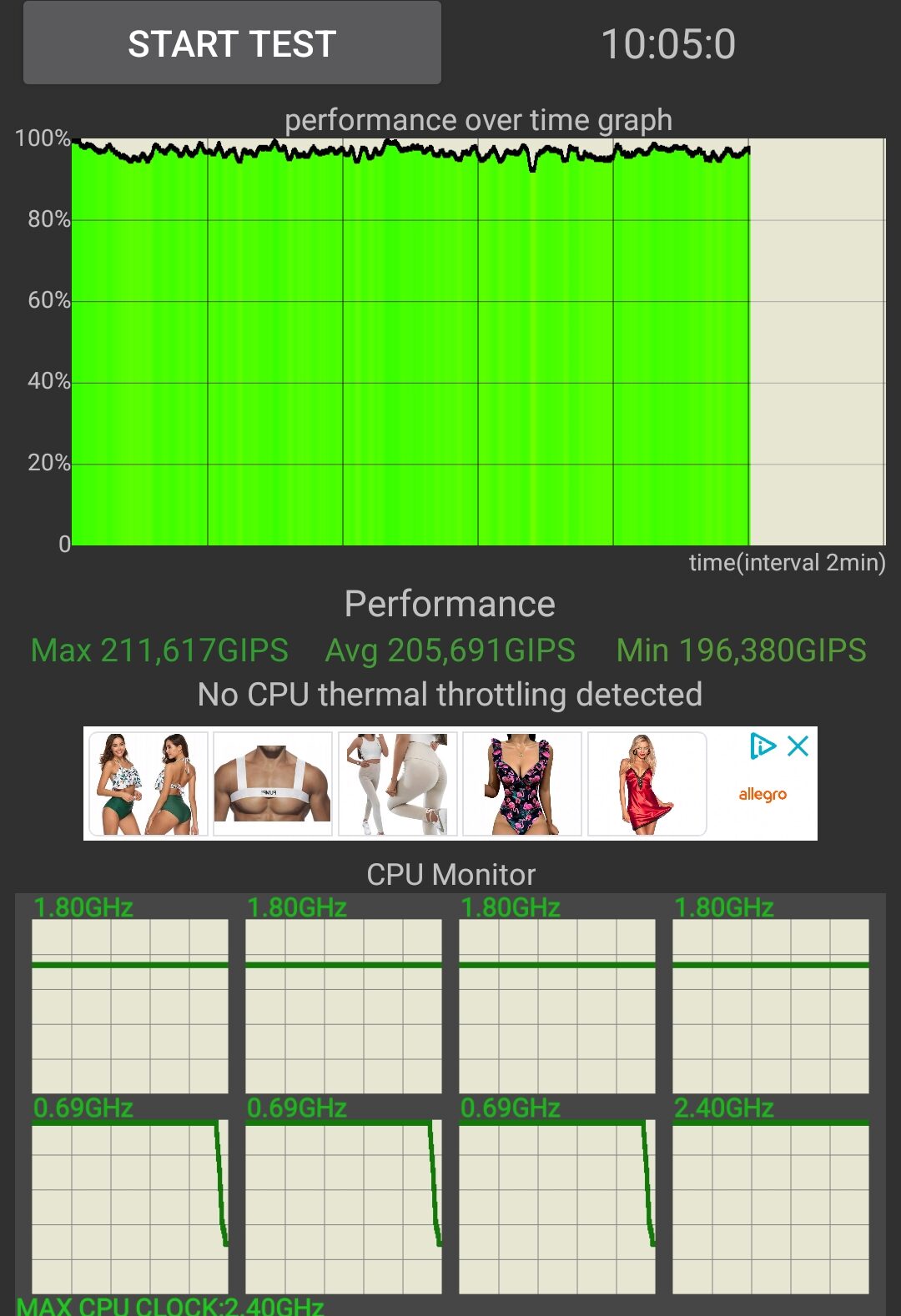 Chciałbym tutaj pochylić się nad kulturą pracy. Do jej zobrazowania jak zwykle posłuży mi benchmark mierzący spadek wydajności w czasie. Na potrzeby tego tekstu ograniczyłem się do 10 minut. Być może w pełnej recenzji puszczę go dłużej, dodając do tego bardziej wymagające warunki. Jak widać powyżej, spadku wydajności… nie ma.