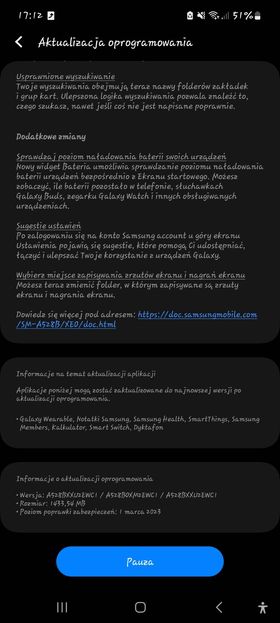 Nasz Czytelnik Tomek poinformował nas, że jego Samsung Galaxy A52s 5G otrzymał w Polsce aktualizację do One UI 5.1 w Polsce. Paczka nosi oznaczenie A528BXXU2EWC1, a jej rozmiar to 1433 MB.