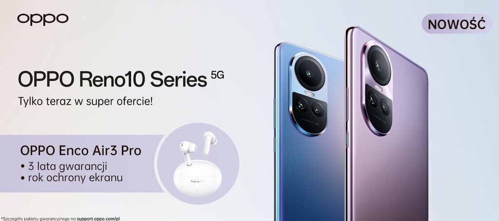 Od 19 lipca do 7 sierpnia, kupując model z serii Reno10 5G w zestawie klienci otrzymają słuchawki OPPO Enco Air3 Pro o wartości 399 zł, 3-letnią gwarancję smartfona i roczną ochronę ekranu. Ponadto przez 3 miesiące będą mogli za darmo korzystać z YouTube Premium (oferta dla nowych użytkowników do wykorzystania do 31.08.2024r.)