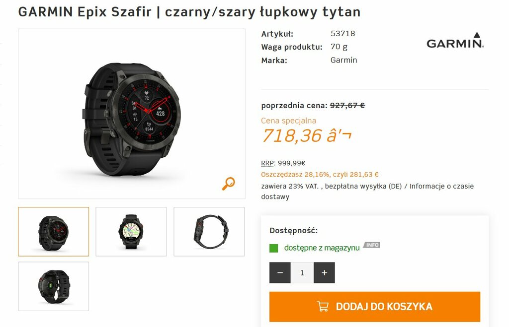 W sklepie r2bike kupisz teraz model Garmin Epix Gen 2 Sapphire Tytan w cenie obniżonej do poziomu 718,36 euro, a najtańsza opcja wysyłki do Polski to DHL za 7,50 euro. Ostatecznie za smartwatch zapłacisz więc ok. 3225 złotych.