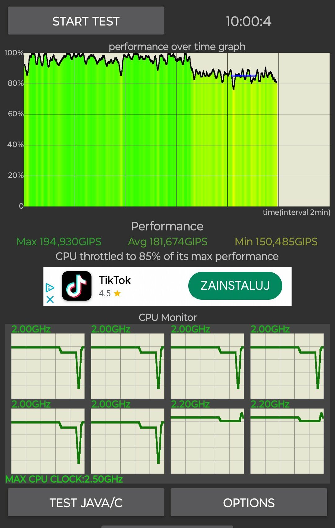Co z temperaturami? Jest świetnie. Tak, jak oczekiwałem po przebrandowanym MediaTeku Dimensity 1080, nie ma też dużego throttlingu. 85% to wynik na przyzwoitym poziomie.