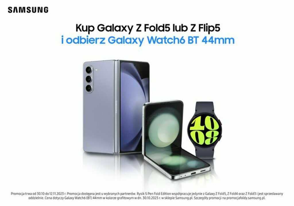 Promocja kryjąca się pod nazwą ECOSYSTEM daje nam możliwość zakupu smartfonów Galaxy Z Flip5 lub Galaxy Z Fold5 wraz z prezentem w postaci zegarka Samsung Galaxy Watch 6 44 mm w odcieniu grafitowym. To podarunek o wartości ponad 1000 złotych.