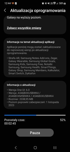 Jak poinformował nas jeden z naszych Czytelników, Krzysiek, jego Samsung Galaxy A54 5G otrzymał w Polsce aktualizację do systemu Android 14 z nakładką One UI 6.0: