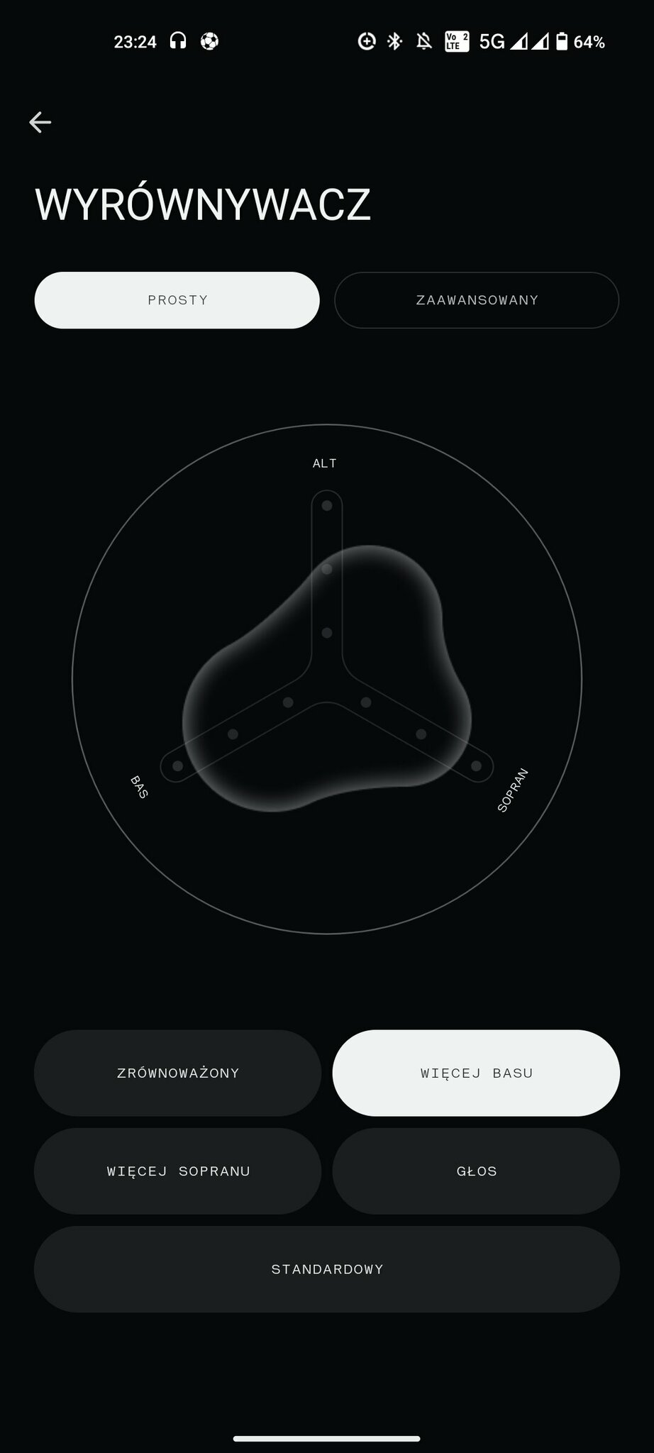 Nie ma tutaj gotowych profili, więc jest to narzędzie typowo dla osób, które chcą się „pobawić” w personalizację brzmienia bardziej. Mamy nawet możliwość podkręcenia konkretnej częstotliwości po wybraniu pasma, więc całkiem rozbudowana „zabawka”. Czy użyteczna? Jak już wspomniałem, głównie dla osób, które mają czas i chęci ustawić słuchawki bardzo personalnie.