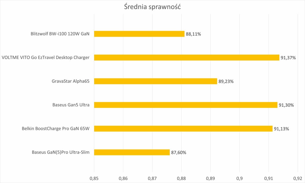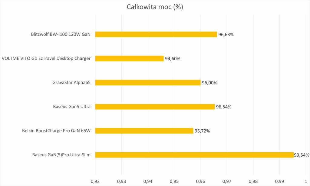 I ostatnia kwestia, czyli spełnienie założenia mocy, o której mówi producent. W procentowej wartości najlepszą robotę zrobił model „zganiony” w sekcji sprawności, czyli Baseus GaN(5)Pro Ultra-Slim. Najgorszą natomiast, ten chwalony, czyli VOLTME VITO Go EzTravel Desktop Charger. Całość zestawienia jednak nie zeszła poniżej okolic 95%.
