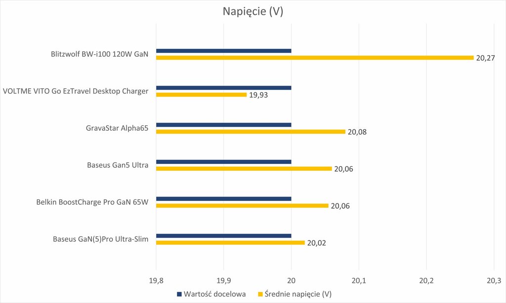 Na pierwszy ogień napięcia. Te raczej nie wyróżniały się w żadnym produkcie, jedynie można powiedzieć, że w dwóch. Pozytywnie zaskoczyła ładowarka Baseus GaN5 Ultra, natomiast negatywnie Blitzwolf BW-i100 120W GaN, która to „wyjechała” sporo od konkurencji w przód. Niestety, negatywnie.
