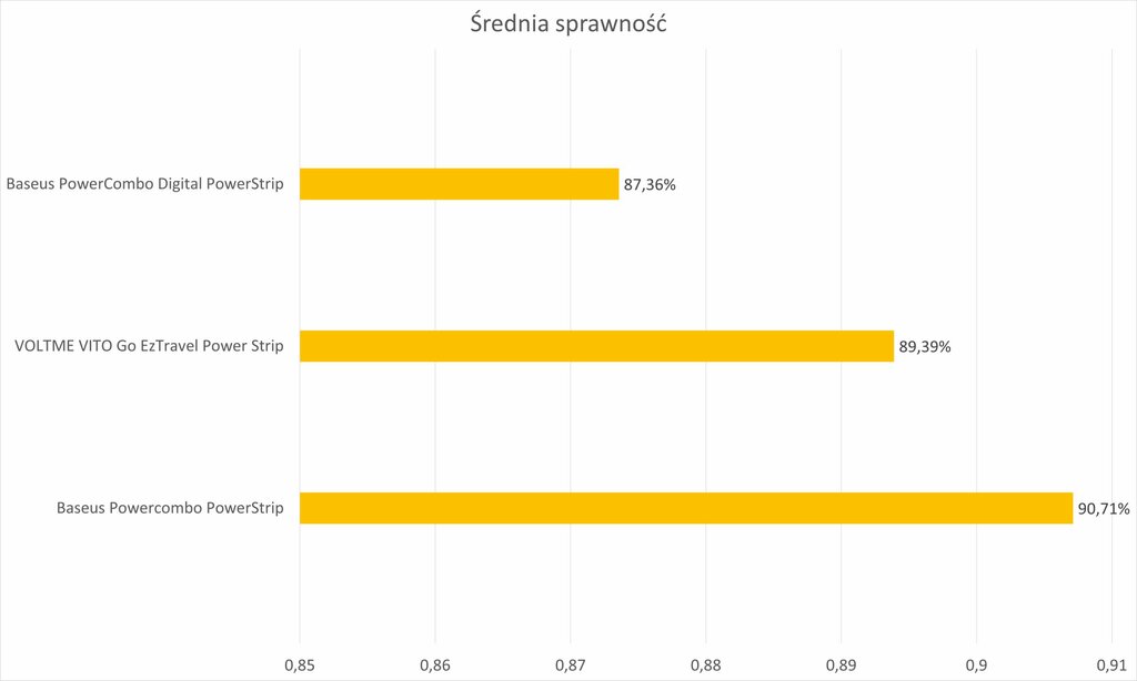 Kolejny parametr to sprawność, a w nim wygrywa Baseus Powercombo PowerStrip, o około 1pp. z propozycją od VOLTME. Najgorzej natomiast sprawuje się, po raz kolejny, drugi produkt Baseusa. Pozostała więc ostatnia zmienna.
